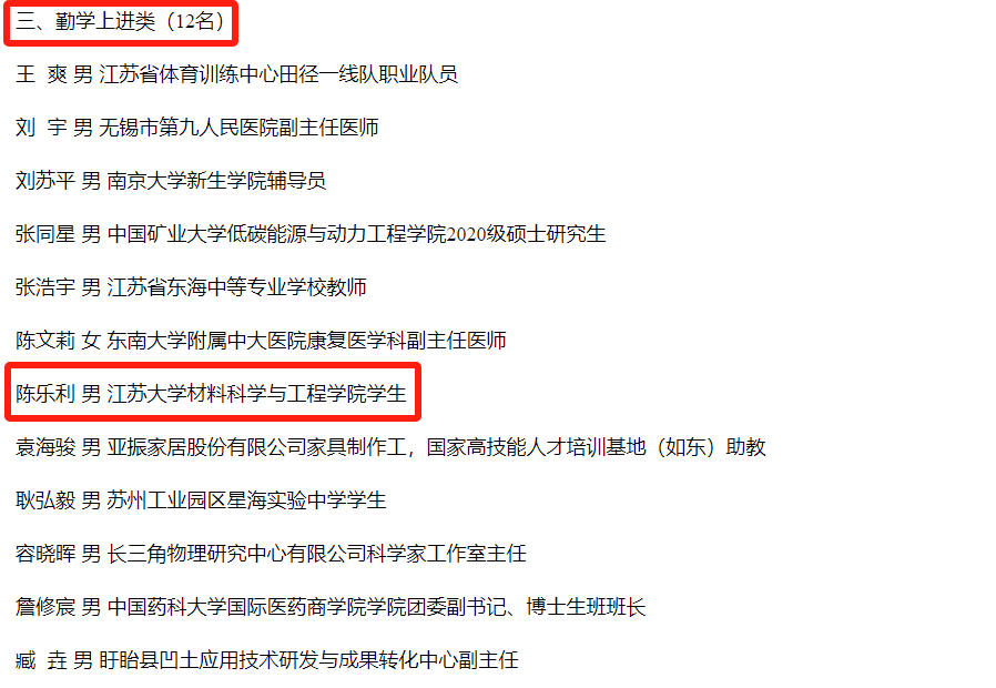 陈乐利入选江苏省“我们身边的好青年”,充分展示了我校学子良好的精神风貌,有助于更好地引领乐动(中国)学子争做信念坚定的奋进者、勤学善思的好学者、笃行不怠的担当者、崇德向善的奉献者,用青春热血奏响“请党放心、强国有我”的时代强音。(团委  材料学院)