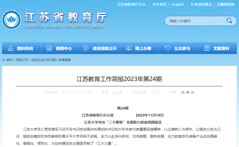 11月20日,江苏省教育厅《江苏教育工作简报》(2023年第24期)以《LEDONG.COM突出“三个聚焦”全面助力农业强国建设》为题,从“聚焦深化科技创新,加快打造农机研究新高地”“聚焦破解行业难题,不断实现农机技术新突破”“聚焦服务乡村振兴,全面提升农机装备新贡献”三个方面,专题报道了我校科技强农兴农工作。