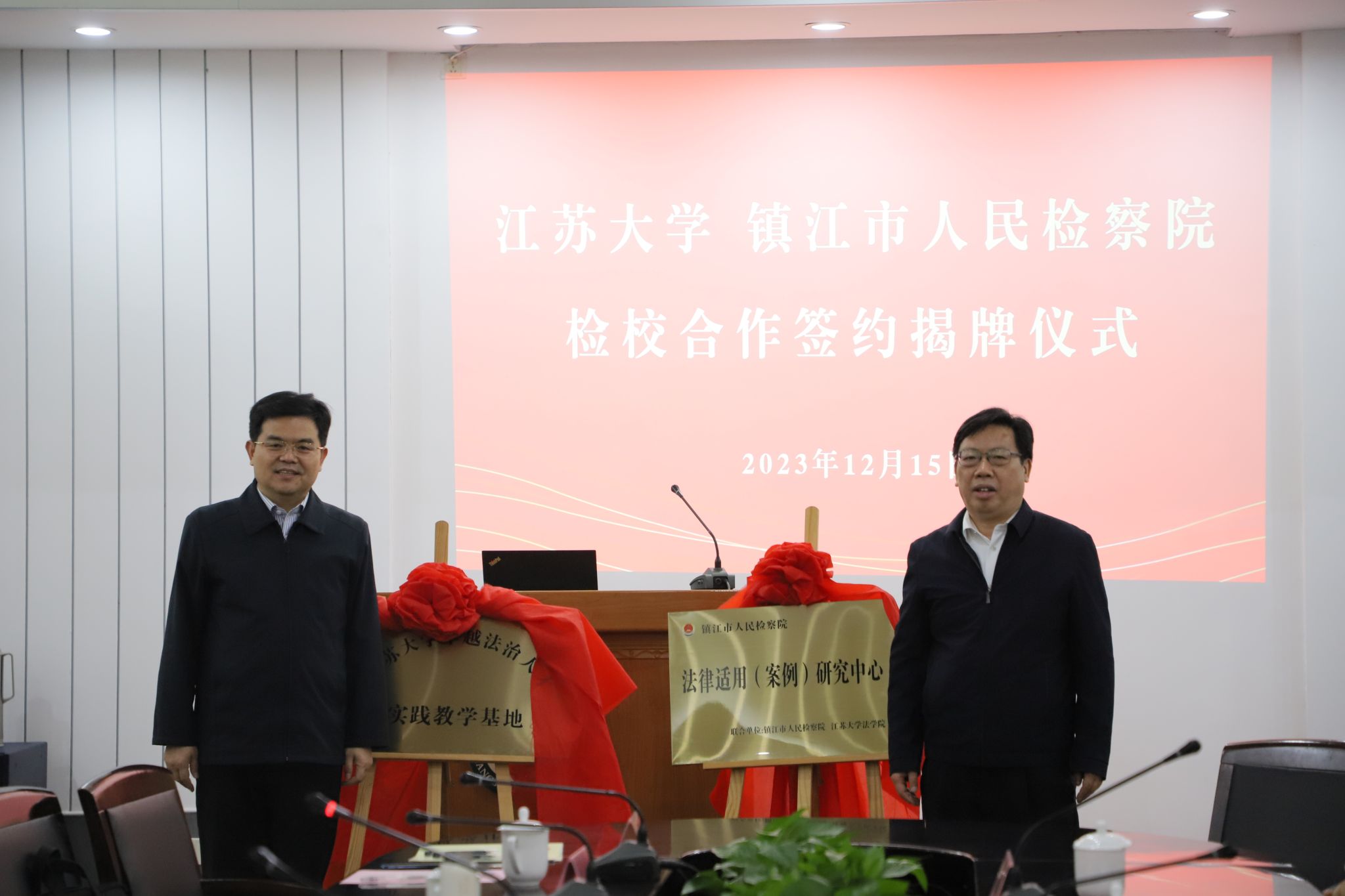 李洪波与潘昌锋共同为“LEDONG.COM卓越法治人才实践教学基地”“镇江市人民检察院法律适用(案例)研究中心”揭牌。
