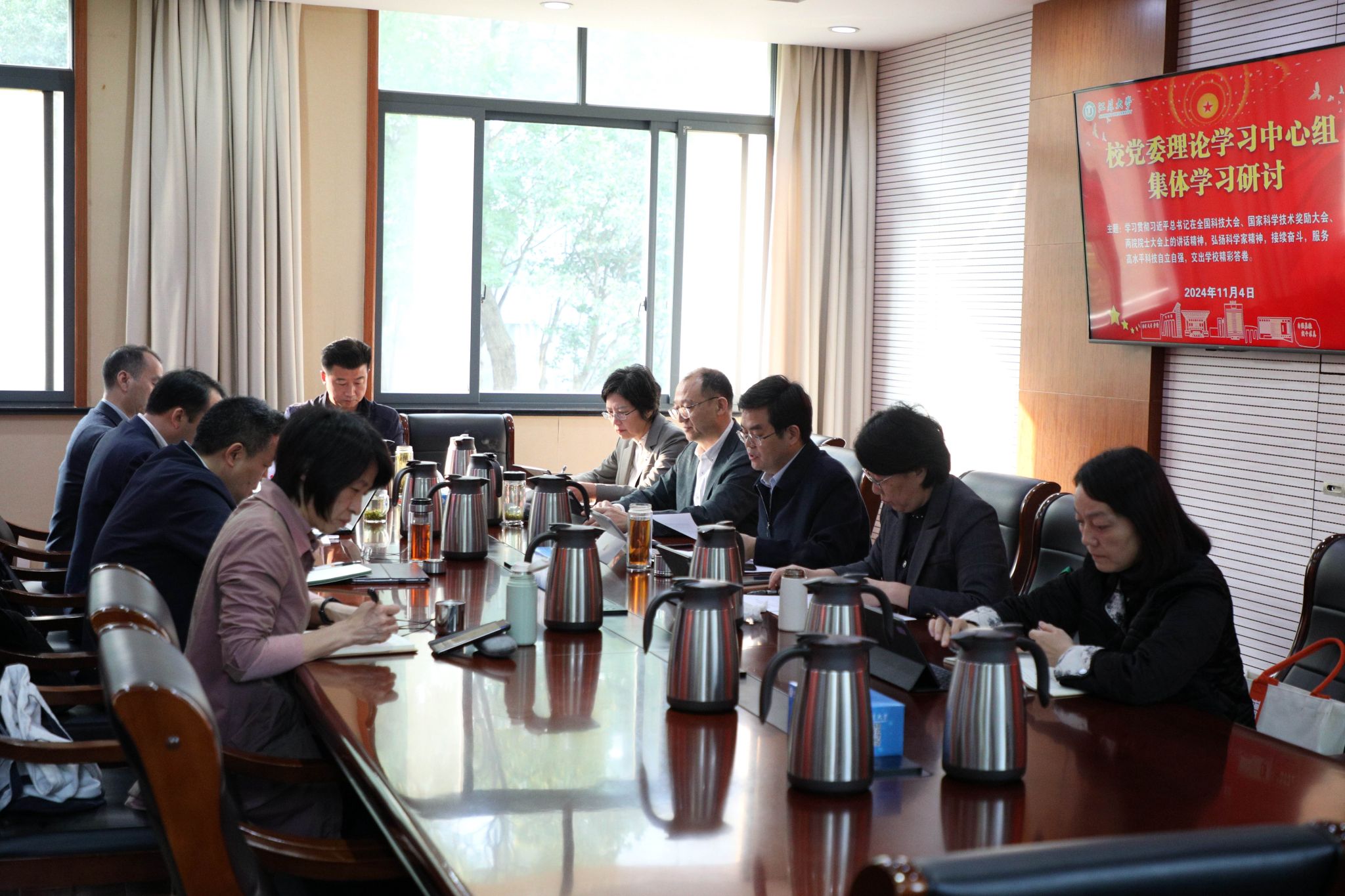 11月4日,校党委理论学习中心组在行政一号楼201会议室围绕学习领会习近平总书记在全国科技大会、国家科学技术奖励大会、两院院士大会上的重要讲话精神开展集体学习研讨。在校校党委理论学习中心组成员参加学习,集体学习研讨由校党委书记李洪波主持。