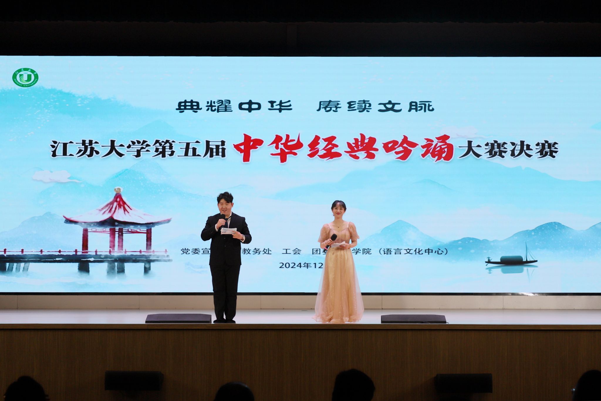 12月13日,由党委宣传部、教务处、工会、团委、文学院(语言文化中心)联合主办的第五届中华经典吟诵大赛决赛在大礼堂举行。校党委副书记张济建,校党委常委、宣传部部长、统战部部长吴麟麟,主办单位以及参赛单位负责人出席活动。