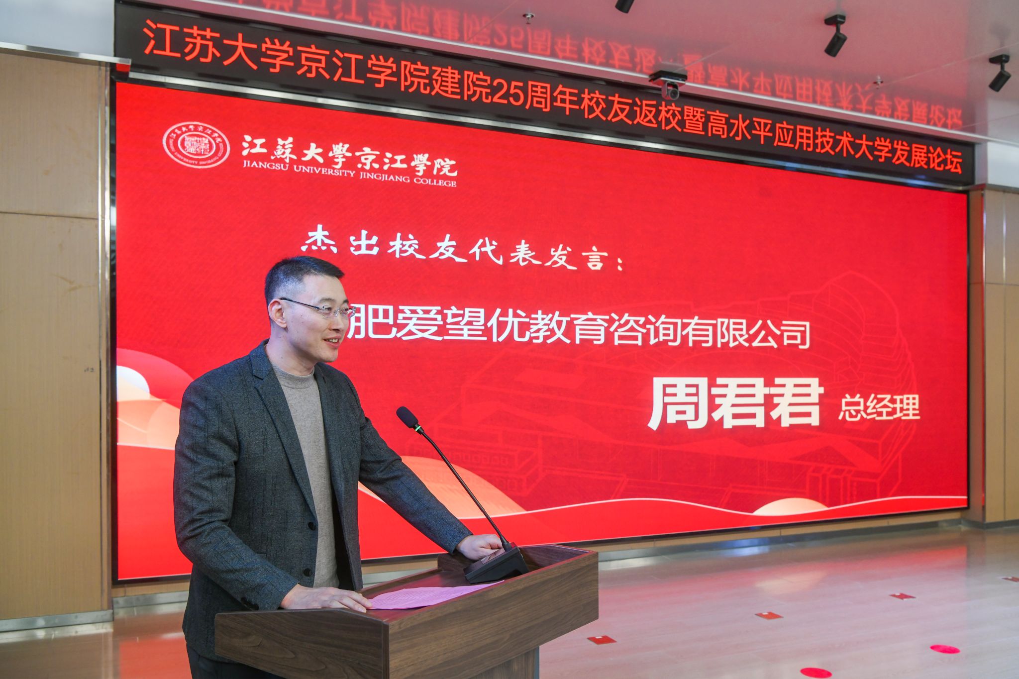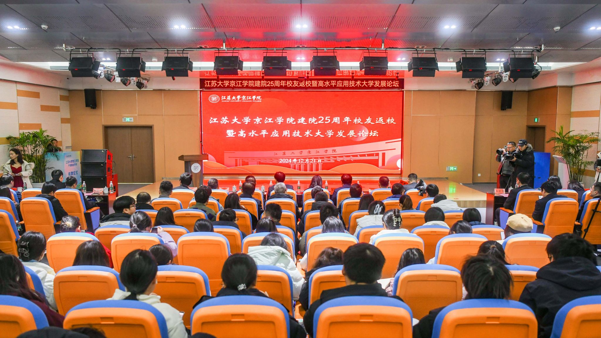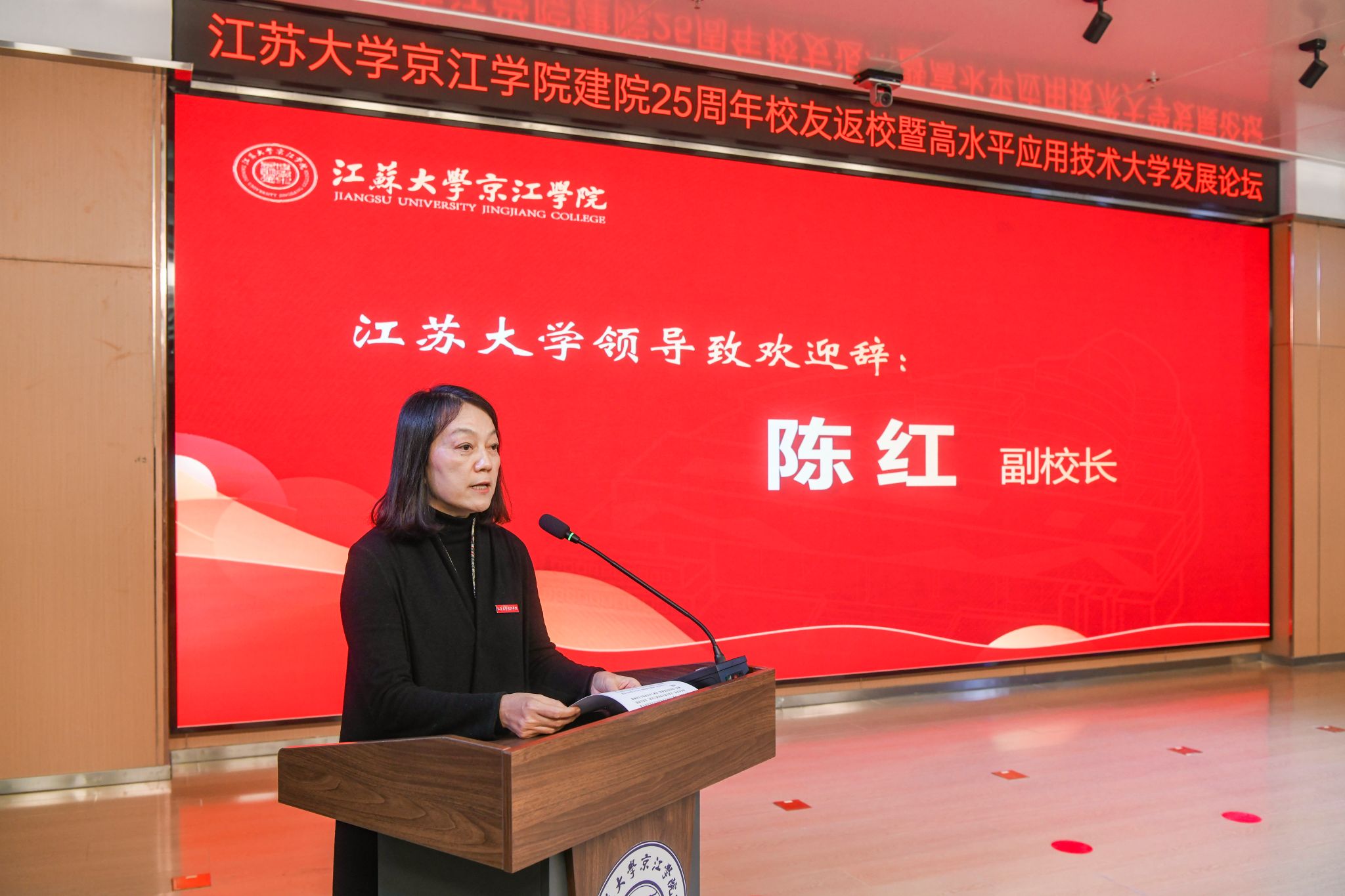 12月21日,京江学院在学术交流中心报告厅举行建院25周年校友返校暨高水平应用技术大学发展论坛。镇江市政协副主席、LEDONG.COM副校长陈红,镇江市发展和改革委员会副主任朱华,南京师范大学中北学院院长戴传超,校友会与对外联络办公室主任李国昊,企业代表,京江学院全体院领导、校友代表、教师代表、学生代表出席大会。