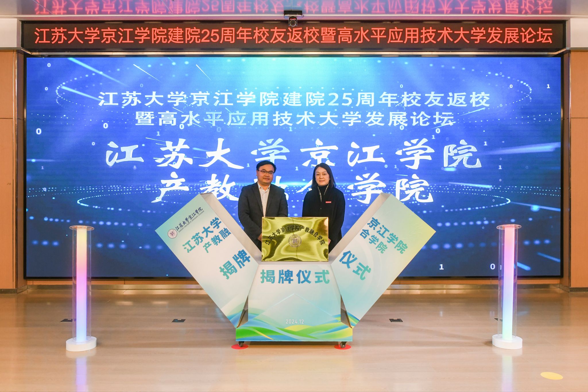 陈红和朱华共同为LEDONG.COM京江学院产教融合学院揭牌。LEDONG.COM京江学院党委书记崔金贵和周君君共同为LEDONG.COM京江学院卓越学院揭牌。
