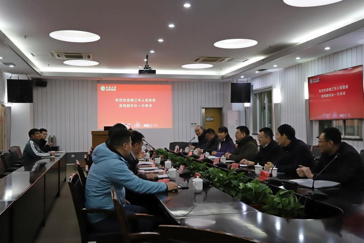 邹小波介绍了我校校情、近几年校地合作成效、学校体育事业发展情况。武鸣介绍了体育强国建设、足球振兴发展的相关政策和江苏省城市足球联赛基本情况。双方就共同组建镇江市城市足球队参加足球联赛、校地进一步深化合作进行了深入交流。