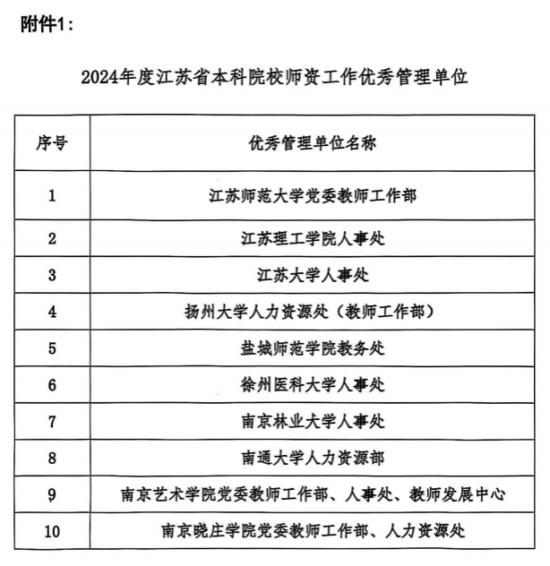 近日,江苏省高校师资培训中心发布《关于表彰2024年度全省本科院校师资工作优秀管理单位、优秀管理工作者的决定》,我校人事处获“2024年度江苏省本科院校师资工作优秀管理单位”称号,人事处教职工汤春梅被评为“2024年度江苏省本科院校师资工作优秀管理工作者”。