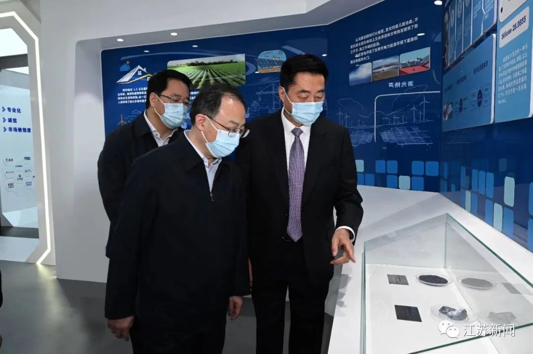 在美科太阳能科技公司,吴政隆勉励企业抓住绿色低碳发展重大机遇,在数字化转型、智能化改造上持续用力,为实现“双碳”目标作贡献。