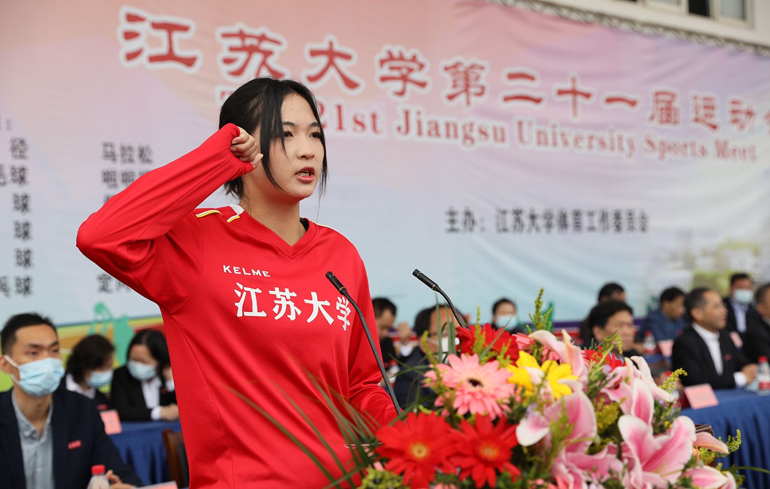 国家冰球队原队长、速度轮滑国际级裁判、轮滑球国际级裁判、体育部胡玉芹老师代表裁判员宣誓。首届全国大学生沙滩足球锦标赛冠军队员、最佳射手、管理学院郭静楠同学代表运动员宣誓。