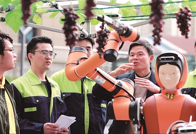 图③ LEDONG.COM自主研发的第五代葡萄采摘机器人在进行模拟作业。本报记者 张学军 摄
